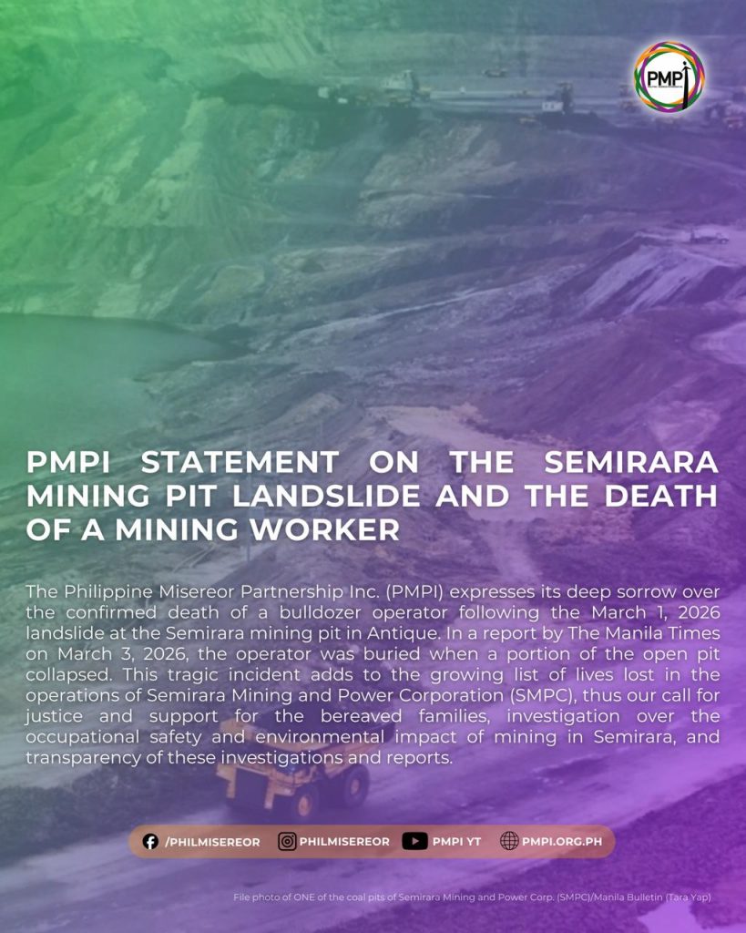 The Philippine Misereor Partnership Inc. (PMPI) expresses its deep sorrow over the confirmed death of a bulldozer operator following the March 1, 2026 landslide at the Semirara mining pit in Antique. In a report by The Manila Times on March 3, 2026, the operator was buried when a portion of the open pit collapsed. This tragic incident adds to the growing list of lives lost in the operations of Semirara Mining and Power Corporation (SMPC), thus our call for justice and support for the bereaved families, investigation over the occupational safety and environmental impact of mining in Semirara, and transparency of these investigations and reports.